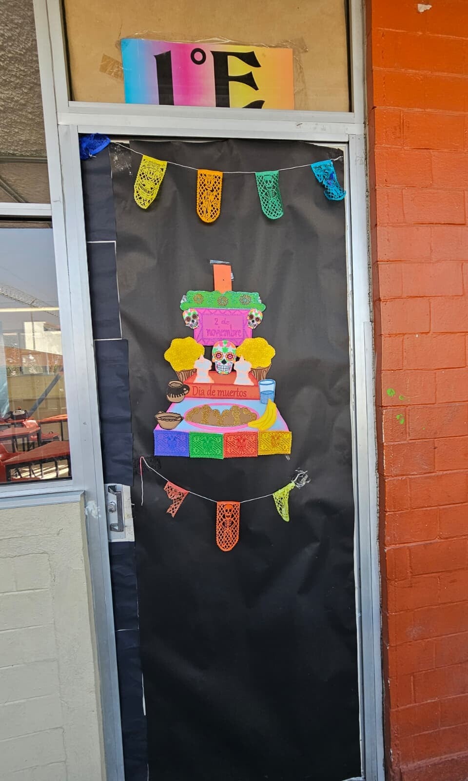 Los estudiantes también participaron activamente en el Concurso de Adornos de Puertas por el Día de Muertos y Halloween, demostrando creatividad, trabajo en equipo y respeto por las tradiciones culturales en un ambiente de convivencia escolar.